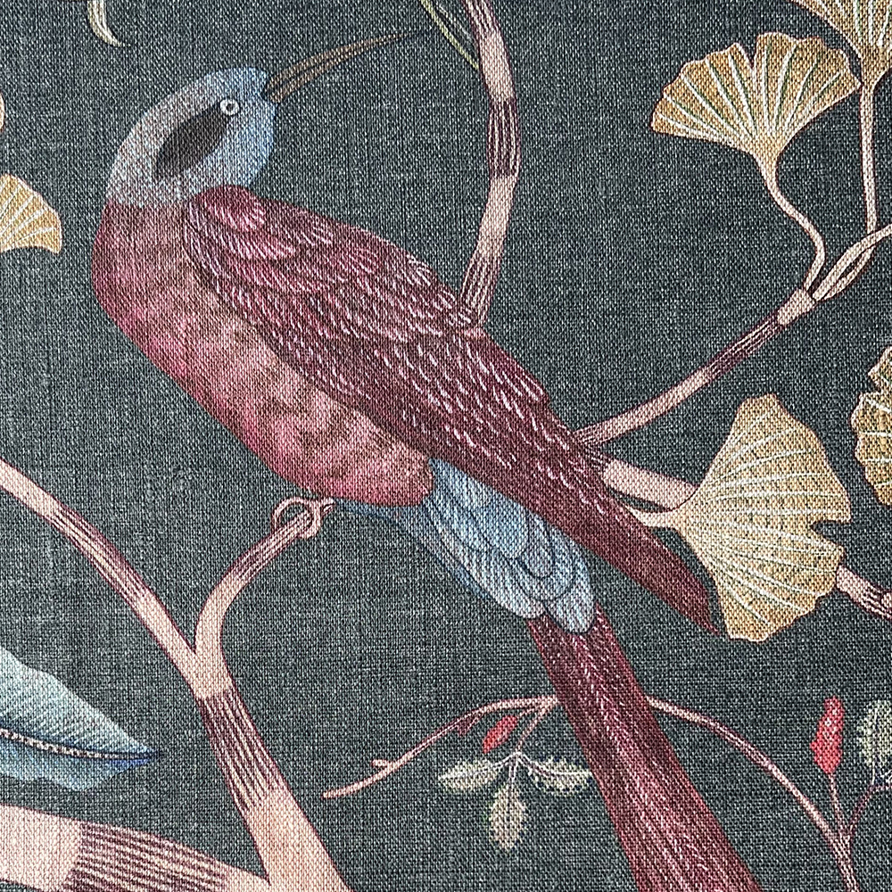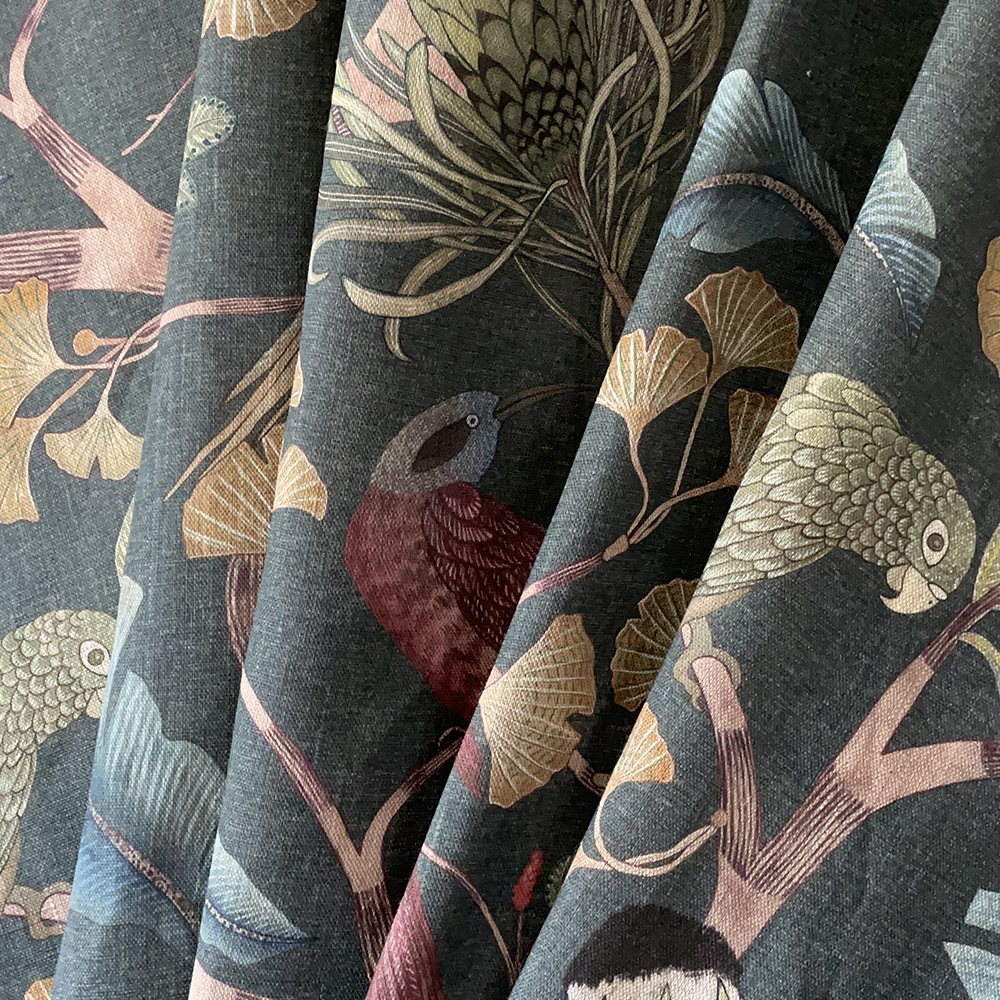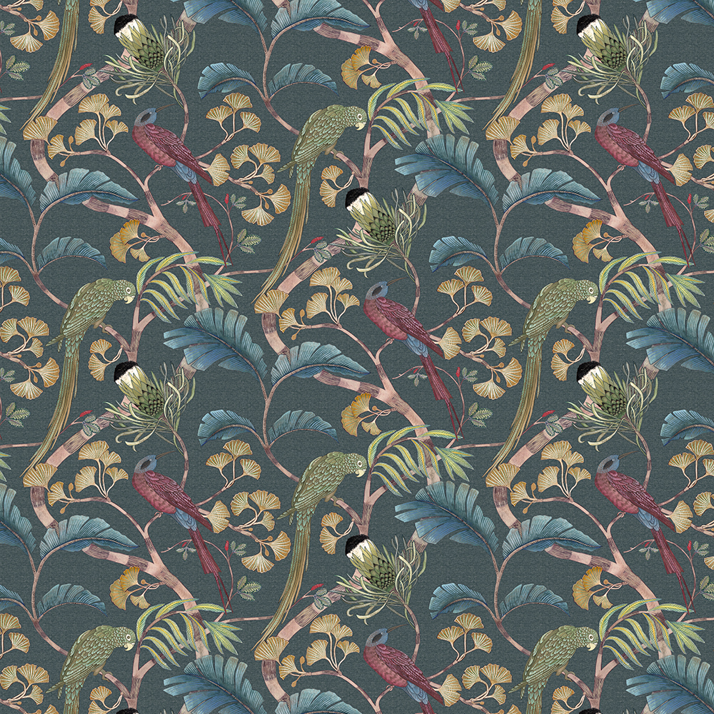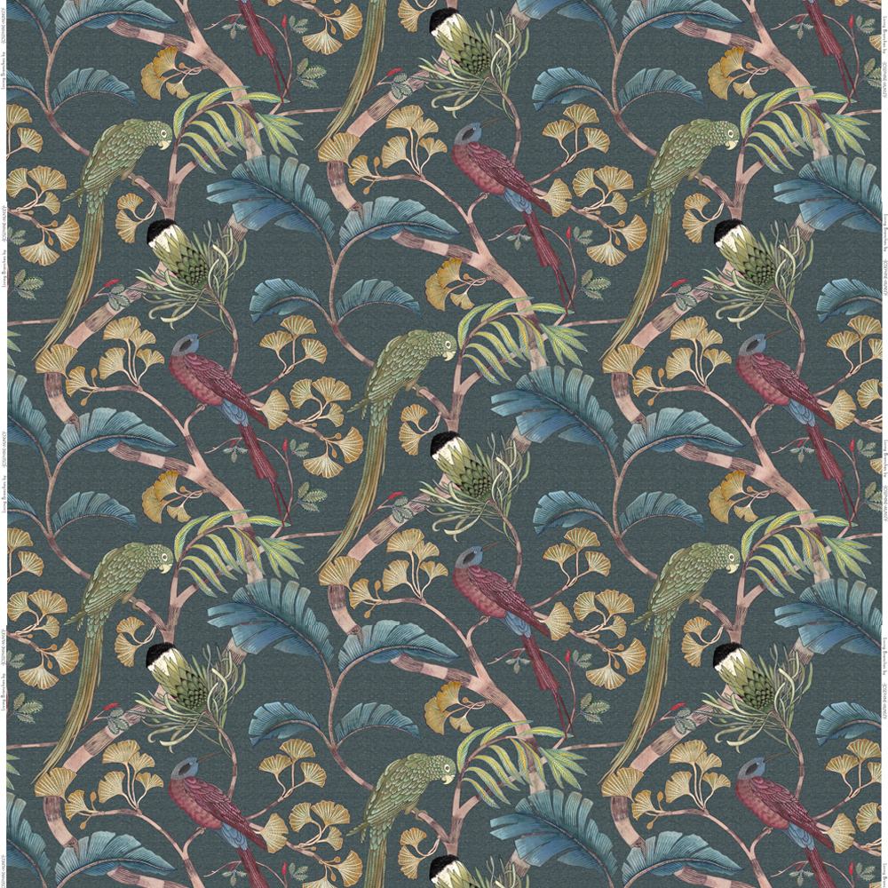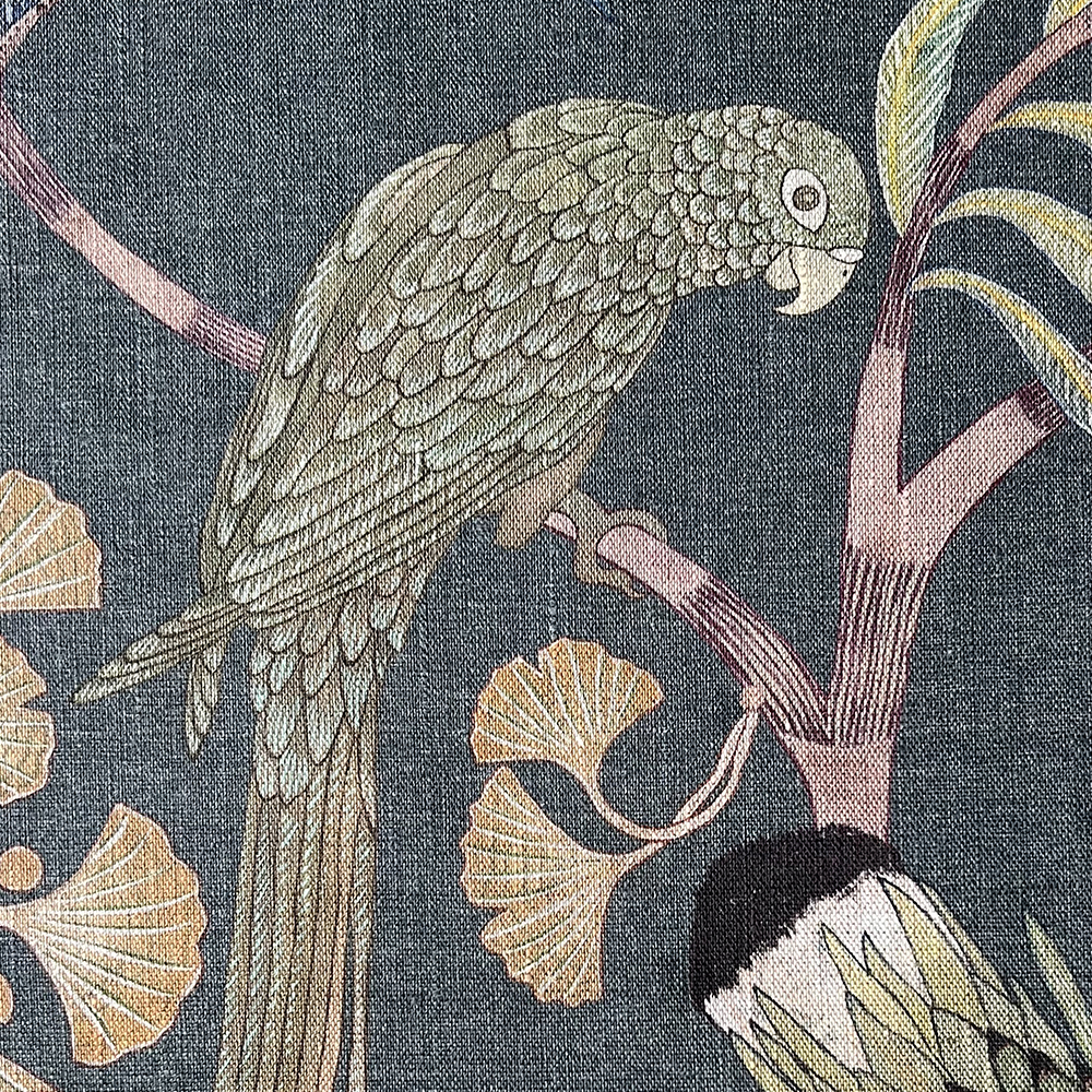 A hand painted tree full of exotic avifauna and flora. Parakeets and sunbirds nestle in the branches, surrounded by lush ginkgo leaves and protea blooms. Hand painted to create movement that will gently meander down your wall. Available in moody dark navy, and softer tones.