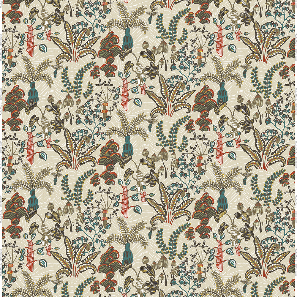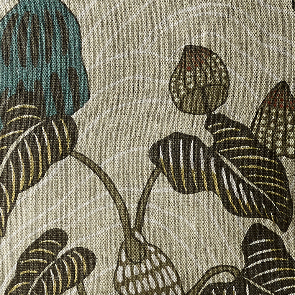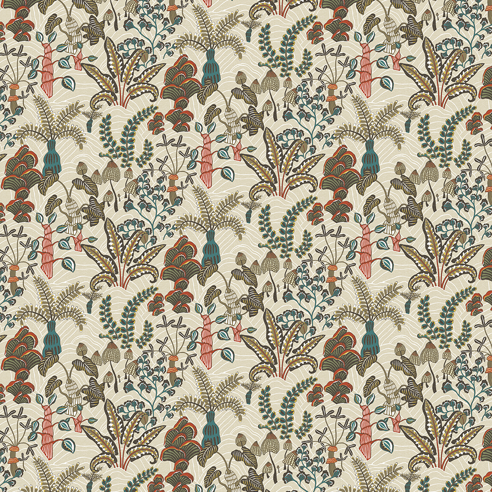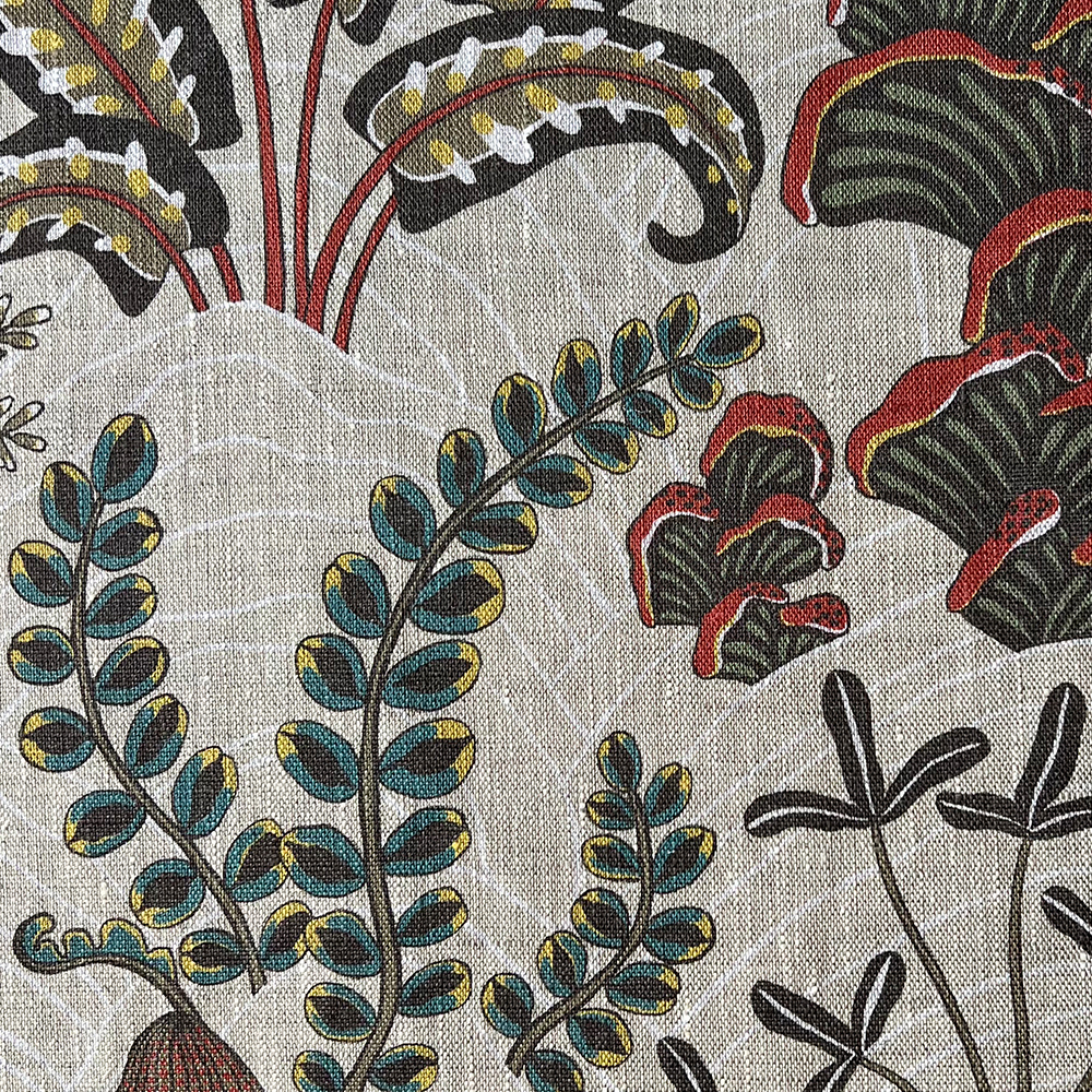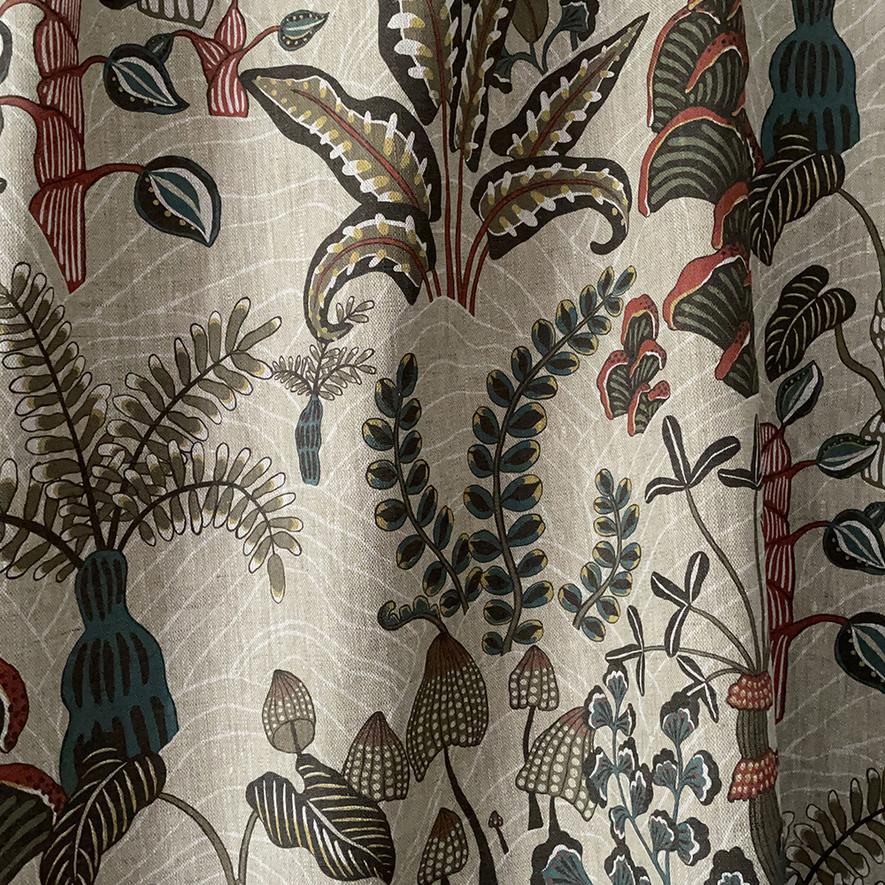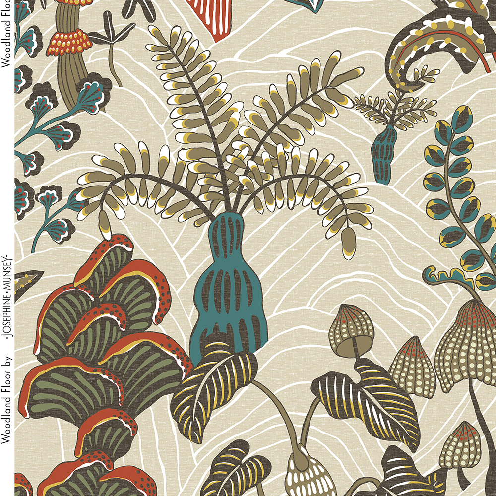 Inspired by a local woodland. Ferns unfold at your feet and mushrooms spill out of tree stumps creating a carpet of interest. Each element was captured, and hand painted.
